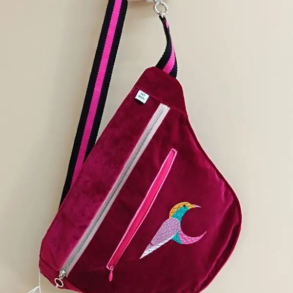 Sac banane/ poitrine en velours bordeaux broderie « Colibri »